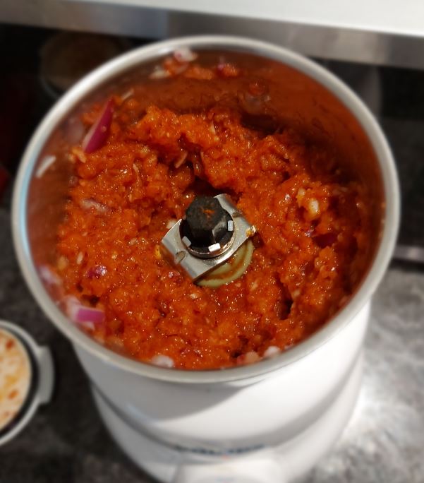Now add the chopped onions and salt to the shrimp powder in the mixer grinder and grind them to a fine paste.